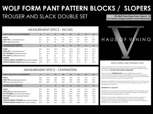 Wolf Form (Sizes 4-18) Pant Pattern Blocks / Slopers - Trouser & Slack Double Set (PRINTED PATTERN)